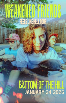 ![]() Saturday January 24 2026 8:00PM doors -- music at 8:30PM ••• ALL AGES $18 in advance / $21 at the door $1 of every ticket goes to this charity: The Ally Coalition Feels LIke Hell Tour Weakened Friends high-energy indie rock TBA ... TBA ... |