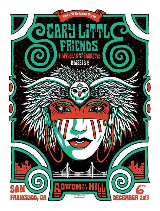 December 6 2013![]() 8:30PM doors -- music at 9:30PM ••• 21 AND OVER $10 in advance / $12 at the door Record Release Party... Papa Bear And The Easy Love www.facebook.com/PapaBearAndTheEasyLove Folk Love Scary Little Friends www.facebook.com/ScaryLittleFriends (Record release) rock folk pop psychedelic Blisses B www.blissesb.com/ Psychedelic/Rock/Folk Papa Bear And The Easy Love The brainchild of singer/songwriter Aaron Glass and many others -From San Francisco, CA -The intention of this project is to spread love and joy through music. Over the years, Aaron has assembled a beautiful catalogue of songs, and awe-inspiring cast of musicians to perform them. Giving a nod to classic song writers such as Neil Young and Elliot Smith, Aaron writes in a style that connects the old with the new, the ancient with the future... All with the purpose to help people connect to each other and themselves. Now the community has grown to be not just musicians, but artists, healers, face painters, circus freaks, and every kind of person out there. At the shows, if you feel like singing, you are highly encouraged, if you feel like dancing, get those feet a movin', and if you feel like sitting and meditating, be a little buddha! So come and be a part of Aaron Glass and Friends. Your soul will thank you. Scary Little Friends ----from San Francisco + Santa Cruz Chris Jones - Vocals, Guitar Charlie Knote - Drums Jon Payne - Bass Other Scary Little Friends: Pat Blizinski - Keys Billy Cramer - Guitar, Bass Scary Little Friends is the brainchild of Chris Jones with Charlie Knote on drums and Jon Payne on bass. Chris built his own studio in the Mission especially for this project, which features lilting vocals, ala Jeff Buckley, and surfs-up psychedelic guitars, which are a trademark of the "San Francisco Sound". Strong songwriting is really the bread and butter of this band. Scary Little Friends is thoughtful and emotional rock/pop songwriting that we want you to hear. Awesome vocals and musicianship. Blisses B ----from SF Benjamin Keegan Noah Libby James Touzel Evan Bautista Alumni: Nick Testa Matthew McBride “…an incredible knack for musical exploration, breaking barriers between genres with reckless abandon. Pushing envelopes to blend bluegrass, rock and punk into an amalgamation of musical originality…” –Shakedown News “…Blisses B don’t so much cross genre divides as run a steam roller over them. The best part is that they truly sound like they relish their complete freedom …” –Americana UK |