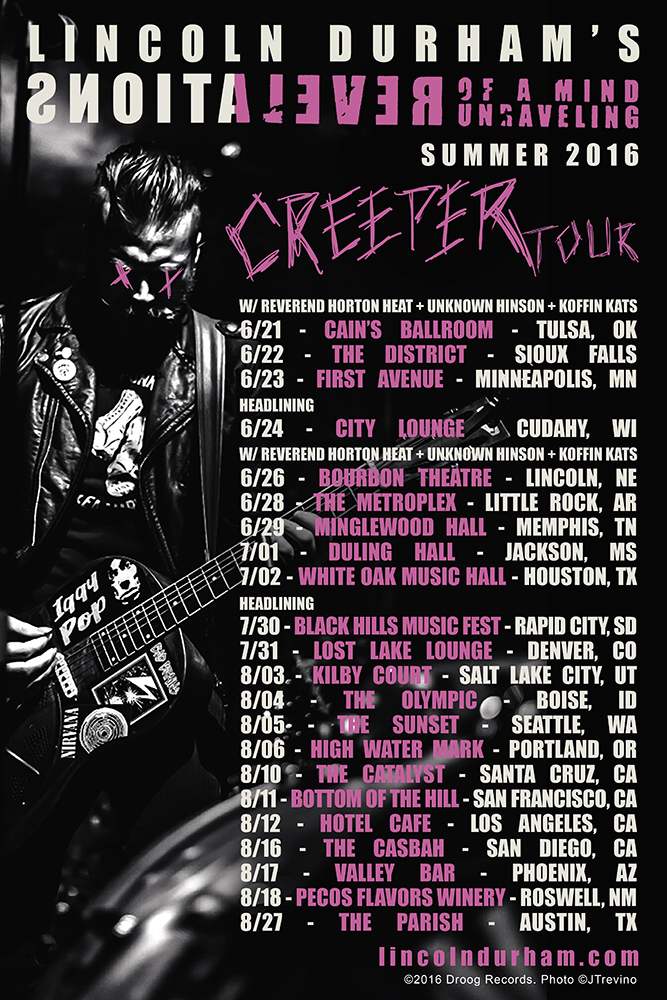 Thursday August 11 2016 ![]() ![]() 8:30PM doors -- music at 9:00PM ••• 21 AND OVER $12 Lincoln Durham Southern-Gothic/Psycho-Blues/Revival-Punk One-Man-Band lincolndurham.com/ Skookum skookumtunes.bandcamp.com/ rock & roll blues country TBA ... Lincoln Durham Lincoln Durham -from Texas/New Jersey -Armed with old bastardized mid-century guitars, hand-me-down fiddles and banjos, home-made contraptions with just enough tension on a string to be considered an instrument and any random percussive item he can get his claws or hooves on, Lincoln Durham is an amped up Southern-Gothic Psycho-Blues Revival-Punk One-Man-Band preaching the good word of depravity. With driving guttural beats back-boning his growling instruments Lincoln births a sound that transcends genres while telling dark and raw tales that Mr. Poe would have blessed with his own tears. His last album, Exodus of the Deemed Unrighteous, aimed to take a hundred-foot scythe to the doubters and the naysayers; and, as if he’s left the field decimated as evidence of his victory and has nowhere left to turn but inward, Revelations of a Mind Unraveling is pure descent into the internal agonies of Lincoln Durham’s tormented mind. - Skookum Sean Salazar, Patrick Calilung, Brendan Tidd, Brian Shima -from Oakland, CA -Skookum is a Western Blues Garage band out of Oakland California. Consisting of the four members Sean Salazar, Patrick Calilung, Brendan Tidd and Brian Shima. Their sounds being influenced from The Soledad Brothers,The Range Rats, to old spaghetti western films with a modern twist. A stripped downraw sound keeps it unique and sets the mood from the beginning. TBA - - |
