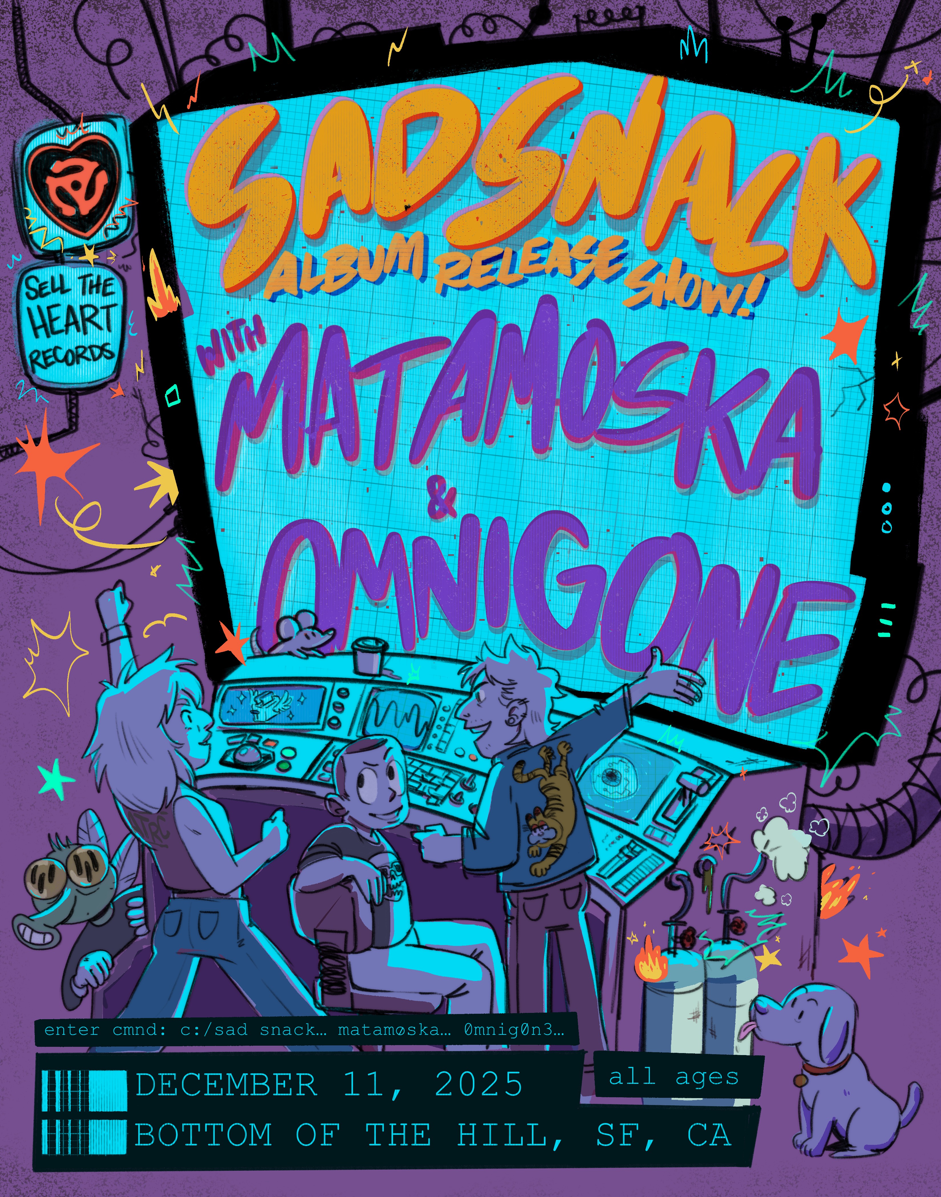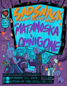 Thursday December 11 2025 ![]() 8:00PM doors -- music at 8:30PM ••• ALL AGES $13 in advance / $15 at the door Sad Snack instagram.com/sadsnack.band ska punk Matamoska instagram.com/matamoska ska punk Omnigone instagram.com/0mnig0ne ska punk Sad Snack -from San Francsico, CA -Following the viral success of Sad Snack’s 2022’s Mountain Goats cover, Sad Snack is releasing a tightly packed half hour of originals. “Vending Machine,” the band’s debut on Sell The Heart Records, showcases the group’s storytelling, four part horn lines, dime-stop genre changes and indie rock riffs. Matamoska -from Los Angeles, CA -Formed during the infancy of Los Angeles’ ghetto Ska-Punk movement and considered “OG’s” of the current Ska movement, Matamoska has been gaining notoriety in the underground ska scene since 2000 for their signature mix of styles, sounds, influences, and languages. The current band lineup includes Jose Padilla (guitar/vox), Richard Sanchez (drums), Hector Rivera (bass), Esteban Flores (keys), Jovan Loera (tsax), Ivan Lopez (tpt), and Robert Verdugo (tbn), however they frequently enjoy having special guests perform such as original lead guitarist Jose Morales (Piņata Protest). Matamoska has been fortunate enough to perform for many different crowds in numerous states in the U.S. as well as parts of Mexico and Europe alongside acts such as The Steady 45s, Be Like Max, and Jungleproof. Additionally, they have been able to perform with some of the artists that have helped shape their sound such as Reel Big Fish, Voodoo Glow Skulls, and Los Pericos. On top of rehearsing and writing for the next EP, Matamoska maintains a vast touring schedule, recently returning from several U.S tours and a two-week tour of Europe, which included performances in France, Germany, Belgium, and the Netherlands. Omnigone -from the East Bay, CA -ATRC x East Bay Ska Punk on Bad Time Records. New album "FERAL” out 7/26/2024 |