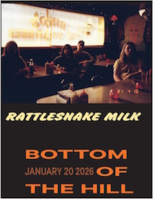 2026![]() 8:00PM doors -- music at 8:30PM ••• 21 AND OVER $20 in advance / $23 at the door Rattlesnake Milk rattlesnakemilk.com punky outlaw country with psychedelic surf rock TBA ... TBA ... Rattlesnake Milk - -From the southern plains of Texas, Rattlesnake Milk summons the sound of the prairie, mimicking the howl of coyotes and the pulsing rhythm of a lonesome junk train. While farming cotton for a family friend, Lou Lewis found inspiration to record an eight-song demo listening to the classics played on KDAV 1590AM in the empty flatlands of his hometown. Those demos paid homage to Lou’s favorite Dust Bowl migrant songs and haunted melodic gems from the 50s and 60s. Now, with the help of Corey Alvarez, and Andrew Chavez, Rattlesnake Milk captures the ephemeral soundscape of the Texas panhandle in the studio and on the stage. TBA - - TBA - - |