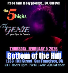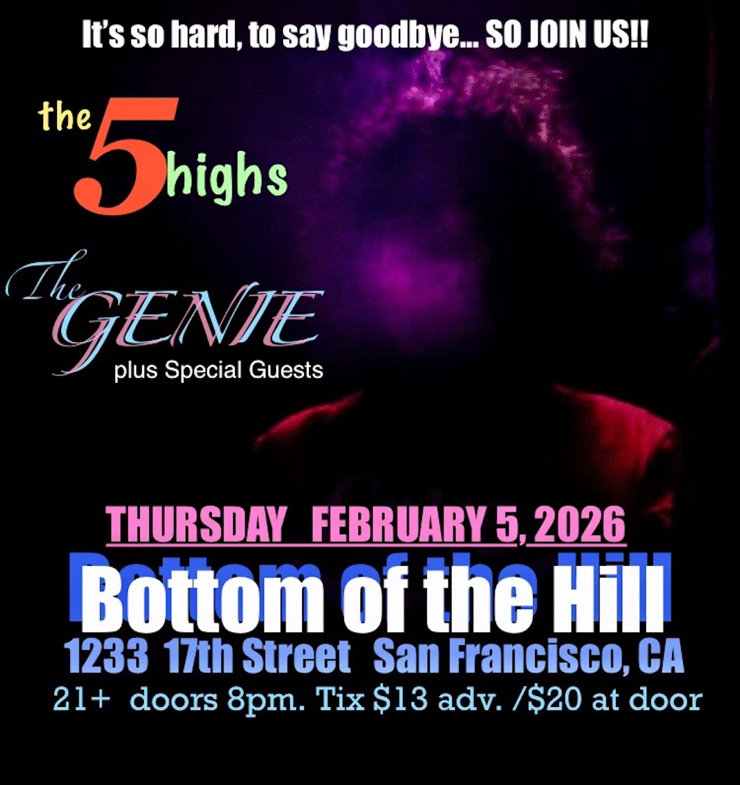 The Five Highs -from San Francisco, CA -Welcome to The 5 Highs — where dynamic rhythms meet powerful melodies. Known for their seamless blend of rock, pop, and soul, The 5 Highs deliver performances that captivate audiences and bring every venue to life. Explore their journey, listen to their latest tracks, and stay updated on upcoming shows right here. Experience the sound that’s defining a new era of music. The Genie -from San Francisco, CA -Sponsored by Line 6 in 2008, The Genie is an avant-garde guitarist, performing artist, and looping innovator from San Francisco. Among the most innovative and specialized live-looping artists today, he is the creator of a unique method called 'scratch guitar' and a live-remixing style called ‘g-mixing'. Refining his craft as a full-time performer for the past fifteen years, he brings together a hybrid of genres while utilizing unconventional live production styles and original looping techniques, creating a uniquely mesmerizing performance. Sean O'Brien and His Dirty Hands -from Kensington, CA -Sean O’Brien is the former lead singer of several California-based rock groups going back in time almost forty years. The groups include: MEANTIME, TRUE WEST, DENIM TV, and THE MARIETTAS. Side projects include Sante Fe, by The Mistaken (Triple X) featuring Gregg Turner of the Angry Samoans.. 1999 saw the release of 12 by The Mariettas, a powerful punk-pop quartet which included former members of several legendary LA-area groups; such as The Leaving Trains, Baby Lemonade and Arthur Lee and Love. Sean returned to his native Bay Area in 2001. His first solo album, Too Personal, was released in 2005 and Seed of Mayhem in 2006 with guest artists Manfred and Tom Hofer of Leaving Trains and Russ Tolman of True West. In 2006 Sean formed his permanent group, Sean O’Brien and His Dirty Hands: featuring Jeff Kane on lead guitar, Bill Davis on Bass, and Matt Shelley on drums. The Dirty Hands recorded their first CD, Goodbye Game, in 2008 with guest artists Sylvia Juncosa and Julie Wolf. In the summer of 2009, Sean released The Drug of Memory, a compilation covering nearly thirty years of recorded work. First Cold Press released a third Denim TV album, “Denim TV – Live at Club Graffiti – 5/30/85?, featuring several previously unreleased songs. In 2012, Sean released Future Harvest, a co-produced with his good friend and musical partner Jeff Kane, who passed away shortly after the album was released. A Tribute to Jeffrey Kane digital EP was released at the end of 2013. Sean O’Brien and His Dirty Hands released latest album, Risk Profile in 2014 and a Deluxe Edition of Risk Profile in 2015. In 2017, Sean released an album of live acoustic performances, It Was Sad Without You There: Acoustic Sessions. Also in 2017, the live band of Greg Lisher of Camper Van Beethoven on guitar; Kevin Thomas White of Chuck Prophet & The Mission Express on Bass, and long-time co-producer/engineer Matt Boudreau on drums released a new four-song EP, Mistakes. An additional track recorded at the same sessions, "Old Black Cloud" was released as a digital single. A promotional video of the track "Sleeping With Me" from the Mistakes EP was also released. In 2019, Sean O'Brien and His Dirty Hands released "My Colors Dark". “Last Hello” by Sean O’Brien and His Dirty Hands was released January 3, 2025 in both in both stereo and Spatial Audio with ATMOS formats. CD and LP formats will be available through Bandcamp. Produced by Matt Boudreau and Sean O’Brien. The LP features Damon Wood, Tom Hofer, Kevin Thomas White and Rick Munoz. Thanks to Jack Rabid, who selected Last Hello to Jack Rabid’s (of The Big Takeover magazine) Picks, 2025’s 200 Best Albums, Singles and Reissues. Recording sessions for tracks were successfully completed recently at Sharkbite Studios in Oakland, CA. An EP is planned and the next Sean O’Brien and His Dirty Hands LP will be released in 2026. Recently a recording session was completed in Oneonta, New York with the great Patrick Strain on pedal steel. Thanks to Patrick and the staff at Dry Hill Recording Studios. Other guest artists on the new recordings include: Amie Penwell, Dave Zirbel, Nathaniel Wolkstein and Adam Rossi. |