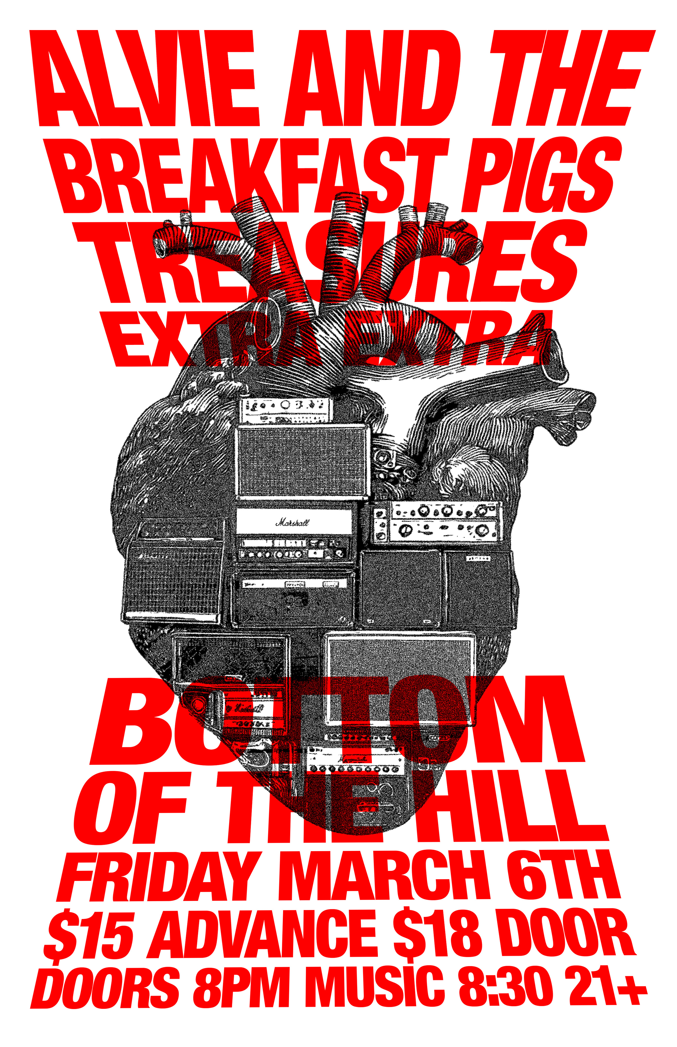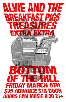 8:00PM doors -- music at 8:30PM ••• 21 AND OVER $15 in advance / $18 at the door Alvie & the Breakfast Pigs alvieandthebreakfastpigs.com garage rock blues punk Treasures treasures.band Rock and Roll, garage pop Extra Extra instagram.com/extraextramusicians dance rock new wave post-punk Alvie & the Breakfast Pigs -from Phoenix, AZ -Alvie & the Breakfast Pigs are loud, raw, and unapologetically real. They’re here for those who wake up with last night’s eyeliner still on, who find poetry in the chaos, and who turn the volume up instead of toning it down. For anyone craving driving riffs, punchy lyrics, and the kind of energy that makes you wanna kick over a trash can, this is the right place. Blending alt and punk with a no-BS attitude, they deliver just the right mix of grit and melody to keep hearts pounding. Crank it up, sing along, and join the madness. For those who love bands that don’t hold back, Alvie & the Breakfast Pigs have something to offer. They don’t chase trends, they carry the torch! We left our hometown of Phoenix in 2015. We landed in San Francisco, hoping to plant roots in the legendary music scene we had heard so much about. We arrived at a time when many artists were fleeing to cheaper pastures as tech companies dominated the city. Ridiculous rent and crazy high prices were not enough to break our spirits. And then…COVID-19 happened. We went on tour in February 2020, then didn’t play a show for a year and a half. But dammit, WE’RE STILL HERE and we’re not taking anything for granted. The Breakfast Pigs are hitting it hard on big-time stages while also working on our next 5 Singles coming out in 2025. Today, the Breakfast Pigs are one of the last remaining rock bands in the city, and we’re not going anywhere. The Breakfast Pigs appeared on stages scross the country like South by Southwest (Austin), Underground Music Showcase (Denver), Balanced Breakfast (San Francisco), Patiyochella (Oakland), Music City Songwriters Festival (SF), TreasureFest (SF), Alternative Tentacles Mosswood Meltdown After Party (Oakland) and alongside such acts as White Denim, Authority Zero, Sam Chase & the Untraditional, The Dirty Few, The Happys, No Small Children, Autonomics, and The Yawpers. Alvie A. Adams Guitar / Lead Vocals Matt Logan Lead Guitar Phil Thorneycroft Bass Guitar Jake Natkin Drums Treasures -from San Francisco, CA -San Francisco has long been a fertile ground for musical innovation. The city’s musical pedigree is as rich and pure as it gets, with countless San Francisco bands becoming bonafide global legends. Treasures, while not quite global legends yet, are certainly well on their way to being added to the pantheon of legendary San Francisco bands. Galvanized by an insatiable hunger to play rock & roll, singer-songwriter Jack Friel, and drummer Bobby Franz, formed Treasures in 2019. Ultimately adding guitarist Corey Largent and bassist Raoul Aguilera to the mix, the newly formed outfit spent the pandemic lockdown writing and recording demos. Those demos reached the ears of producer Mikel Ross (Corrosion of Conformity) and engineer Travis Kasperbauer (The Go-Go’s) who immediately recognized what they’d found and promptly put the band in a pro studio environment. The bands’ first LP, Gold Rush City, delivered what many refer to as a “modern classic”, lush with memorable hooks and melodic passages that surprised and delighted modern and classic rock lovers alike. Currently recording and mixing songs for a brand new, full length album to be released throughout 2025, Treasures has become a shit hot rock & roll band, selling out local shows across the city, continuing to define their vision of a contemporary Rock experience. Extra Extra -from Oakland, CA -Read all about it: High-energy electric-disco septet seeking an elusive sound that, once woven into a beat of danceable proportions, leaves all audiences wanting more. Extra! Extra! hails from the East Bay and champions a sound whose influences include all the great disco, post-punk, and synth-driven hits of the last 50 years. |