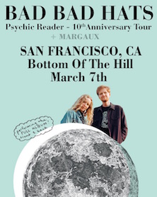 2026![]() 7:30PM doors -- music at 8:30PM ••• ALL AGES $25 Bad Bad Hats badbadhats.com alternative indie rock Margaux instagram.com/margauxtosleep indie-folk, alt-americana TBA ... Bad Bad Hats -from Minneapolis, MN -Bad Bad Hats is an indie rock band from Minneapolis, Minnesota. Kerry Alexander and Chris Hoge met in college and formed the band in 2012. In the 10 years of BBH, they have toured the country many times in their trusty minivan, sampling the best local cuisine along the way. BBH has toured with The Beths, Margaret Glaspy, The Front Bottoms, Hippo Campus, and Michelle Branch, among many others. Their fourth album Bad Bad Hats will be released April 12, 2024 on Don Giovanni Records. Margaux -from New York, NY -Margaux (born Margaux Bouchegnies) is a singer-songwriter based in Brooklyn, NY. Born to a French father and an American mother, Margaux grew up in Seattle. She picked up guitar first, then upright bass, and began writing songs inspired by Motown, Pixies, and Dirty Projectors. Bass in hand, she moved across the country to study jazz at the New School in Manhattan. Bouchegnies later TBA - - |