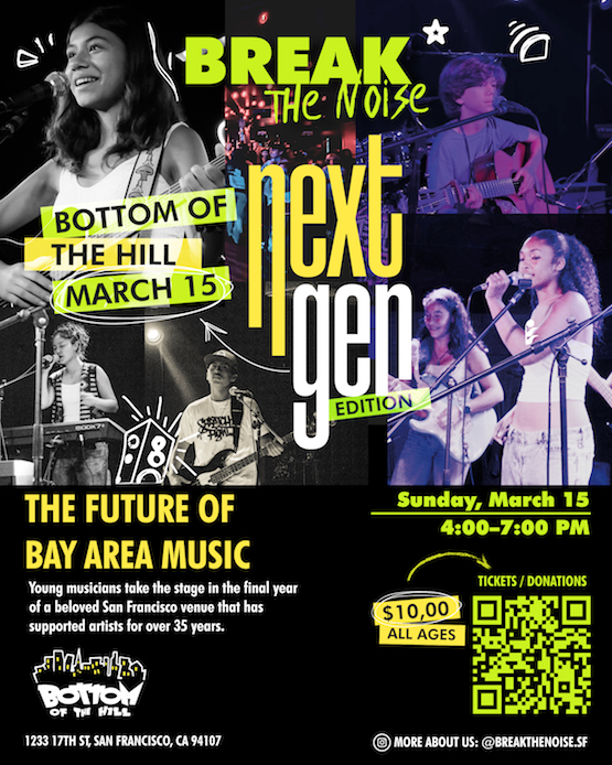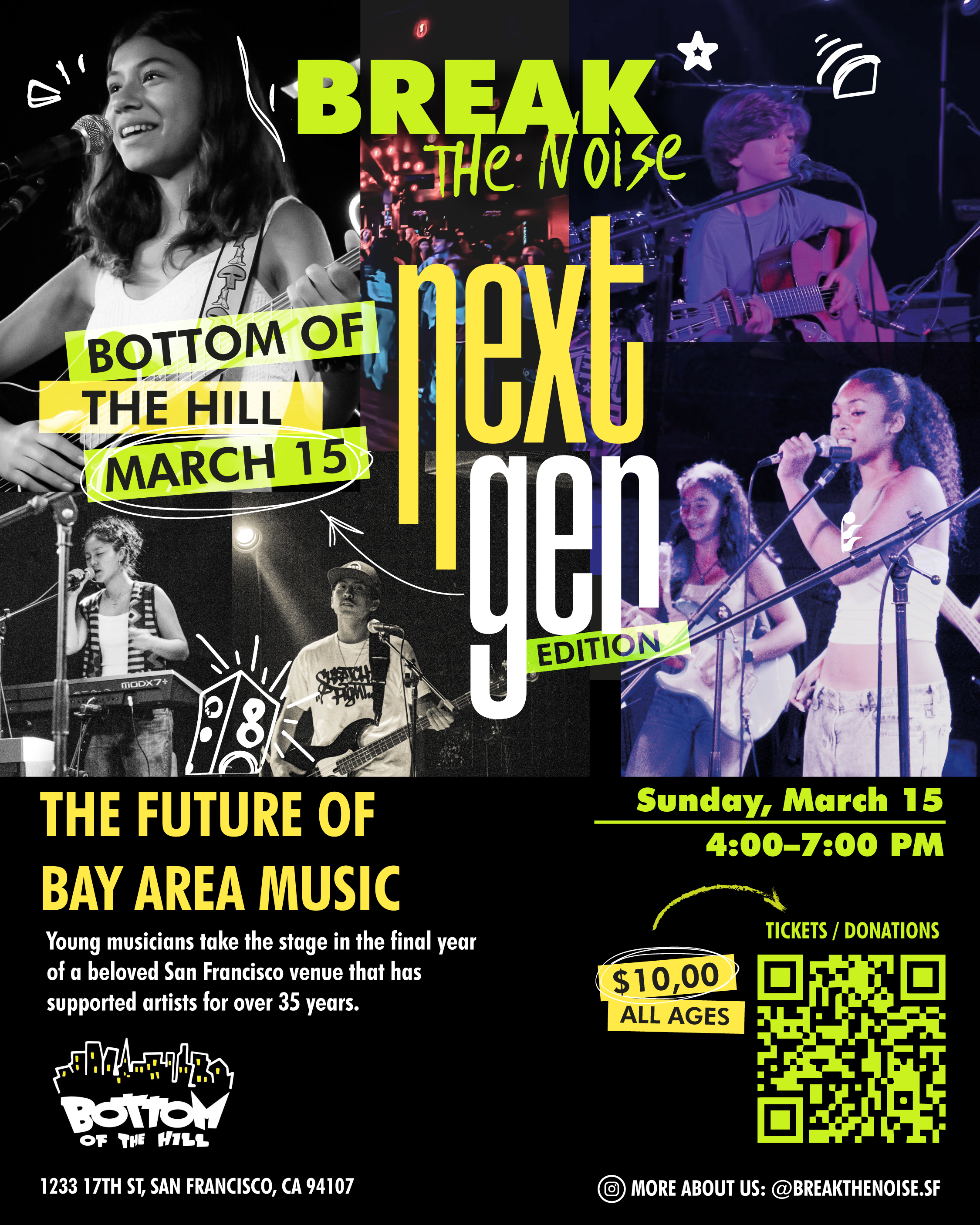 2026![]() 4:00PM ••• ALL AGES $10 Break The Noise Next Gen Edition You can't miss this! Young Bay Area musicians take the stage in the final year of an iconic venue for a high-energy afternoon of live music. This Break the Noise NextGen Edition concert celebrates the future of music while honoring a legendary stage. Break the Noise is a youth-led nonprofit creating access to professional stages for the next generation of artists. website: www.breakthenoise.org instagram: @breakthenoise.sf