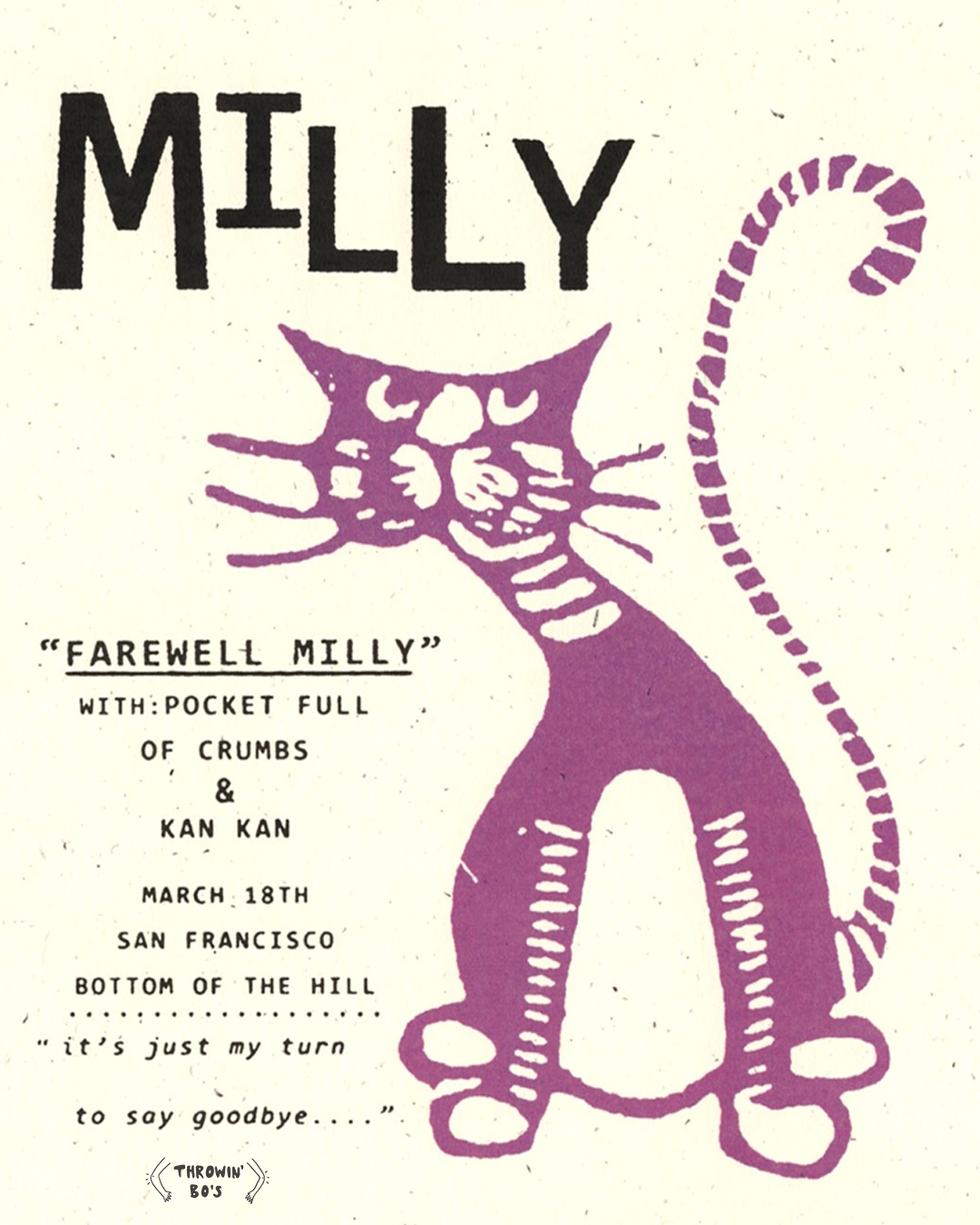 7:30PM doors -- music at 8:00PM ••• ALL AGES $16 in advance / $20 at the door Throwin' Bo's co-presents... Milly millymusicgroup.com melodic alt-rock shoegaze Pocket Full of Crumbs instagram.com/pocket.full.of.crumbs rock-roll Kan Kan instagram.com/kankan psychedelic synth pop Milly -from Los Angeles, CA -Alison Berry, Nico Moreta, Brendan Dyer, Yarden Erez Pocket Full of Crumbs -from San Francisco, CA -Feet on the ground, head in the Ska Kan Kan -from San Diego, CA -Car Country might not be the best album to ever come out of San Diego, but it is the best San Diego Album I’ve ever heard. Kan Kan did it because Kan Kan knows the city. They know that: Someone living in a double-wide in Lakeside with a 99 Civic and someone living in two stories with a tesla in Del Mar see themselves as the same. Someone in Santee sees themself as working class on account of a lifted F150 (new, 2021) & construction job (parents own company, salary 350K). Someone lives in a culdusac off the Boulevard in 1)El Cajon, 2017 Camry (Uber Owned & User Leased) 2) La Mesa, 2003 Corolla (250k miles+) 3) College Area, 2011 Odyssey (broken down, bike only) 4) Talmadge, 2004 3 Series (check engine on) 5) City Heights, 2009 Accord (300k+ miles) 6) City Heights, 2011 Frontier (coolant smoke blows thru ac vent) Speaking Arhamaic, English, Oromo, Spanish, Vietnamese, & more Slacker savants somehow in lineage of a goon like James Joyce, Kan Kan made a whole album about one long street in San Diego, El Cajon Boulevard (ECB/The Boulevard), and about what its like to have a car & phone. In these topics they captured that combo of universal and specific that makes you cry listening to it in a motel room, smelling ghosts of your smoking room’s past. Kan Kan are what a boy band would be if they never found a manager. All members (current and past) have dedicated fancam accounts. Get deep enough into DIY-SD-Tumblr and you’ll find the quiz “Which Kan-Kan Are You?” Kellen (drums)- destroying irony asshole gravitas and staring furrow-browed through CA’s thickest glasses. Joe (bass)- asking questions so direct, while looking at the tree just out of frame, that people respond by speaking words until they’re at the truth of matter. Cameron (guitar, vocal)- finding revolutionary praxis by being late to every job and poetry in the sweat stain on the bus cushion. But you can’t be Kan Kan. You’re not gonna make a song under 90 seconds that encapsulates the forced alienation of the middle-aged with the kind of empathy they do (Nasty AM). Nor make another song under 90 seconds that tells a better coming of age story than Linklater (215). You’re not gonna make such an honest song about tragedy (Pretty Horses). Nor accurately define a whole city by poetry (Hotel Circle). Make an outro as natural and essential (Car Audio Heaven). Write a riff or melody thats such a true fucking classic (Time Manager & Freedom Guitar). Kan Kan knows what they’re doing and they do it perfectly. - Reoh Darwell |