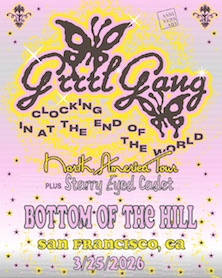 ---rescheduled from 10/5/20257:30PM doors -- music at 8:00PM ••• ALL AGES $15 in advance / $18 at the door Grrrl Gang instagram.com/grrrlgang Pop, punk, dream pop TBA ... Starry Eyed Cadet instagram.com/starryeyedcadet dreamy pop shoegaze Grrrl Gang -from Yogyakarta, IDN -Always up to no good - Hailing from the cultural city of Yogyakarta, Indonesia, Grrrl Gang is a rising force in the independent music scene with their infectious melodies, anthemic songs, and electrifying live performances. The power trio, composed of Angee Sentana on guitar and vocals, Akbar Rumandung on bass, and Edo Alventa on guitar. Grrrl Gang's music is a celebration of their collective roots and a testament to the power of pop music to connect people across cultures and borders. Their lyrics touch on themes such as feminism, mental health, and relationships with a raw honesty that speaks to a generation of young listeners. With their infectious energy, socially conscious lyrics, and unique sound, Grrrl Gang is poised to take the global music scene by storm and become a voice for a new generation. TBA - - Starry Eyed Cadet -from San Francisco, CA -Inspired by Sarah Records with a touch of Creation and 4AD Records, Starry Eyed Cadet formed in San Francisco in 2013. With all band members as active songwriters and composers, they describe themselves as "all over the place" but remain glued together by everyone's similar sound sensibilities. Starry Eyed Cadet are Gil Castro, Russell Gong, Aprille Aquino, Rob Uytingco and Sally Jati. |