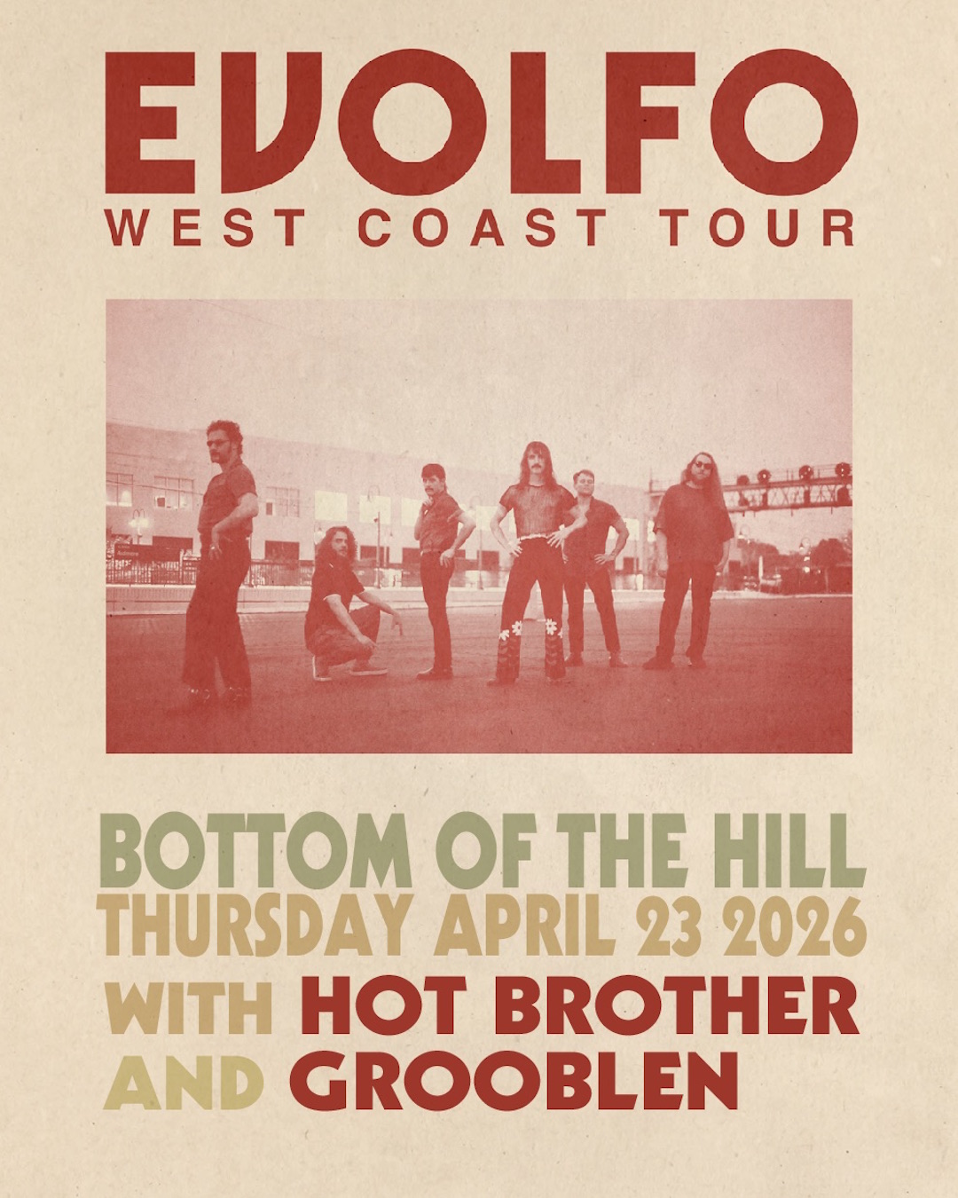 2026![]() 8:00PM doors -- music at 8:30PM ••• 21 AND OVER $15 in advance / $20 at the door Evolfo evolfo.com garage soul psychedelic Hot Brother instagram.com/hotbrotherlovesyou alternative indie rock singer-songwriter Grooblen grooblen.space progressive rock psych Evolfo -from Brooklyn, NY -This is the colourful, fuzz laden psych world of Brooklyn's Evolfo, who's homegrown musical universe forever expanding. "The Changer" is a collection of uptempo electric nuggets and colourful fuzz laden outbursts from Evolfo made for the real psych and garage heads. This little album can be regarded as a companion piece (or perhaps the snotty younger sibling) to Evolfo's 2021 LP "Site Out of Mind", as it was mostly recorded and mixed during those very same sessions. While sequencing "Site Out of Mind", Evolfo found that these tracks stood out too boldly and recklessly for the flow of the LP, but they were much too fun and beguiling to be put to rest forever. Pulled from the title of the EP's single, the name "The Changer" makes an ominous and fitting description for Evolfo. Because "The Changer" showcases the band continuing to do what they do best: boldly changing and changing, trying on new sounds, exploring little pockets of the sonic cosmos and coming back with something different every time. Hot Brother -from San Francisco, CA -Vocals + Guitar - Brittany Powers Drums - Nick Cobbett Lead Guitar - Jeremy Lyon Bass - Ben Berry Bass + BGV's - Trevor Bahnson Violin - Graham Patzner Organ - Jesse Lemme Adams Recording Engineer - Jeremy Lyon, Matt McDavid, Ian Pellicci Mixing Engineer - Jeremy Lyon Producer - Nick Cobbett + Jeremy Lyon Songwriter - Brittany Powers Album Design - Matt Goff Album Photo - Harrisono McArtor Grooblen -from San Francisco, CA -topsy turvy cabaret psych from San Francisco. adjective descriptor music for things and friends. |