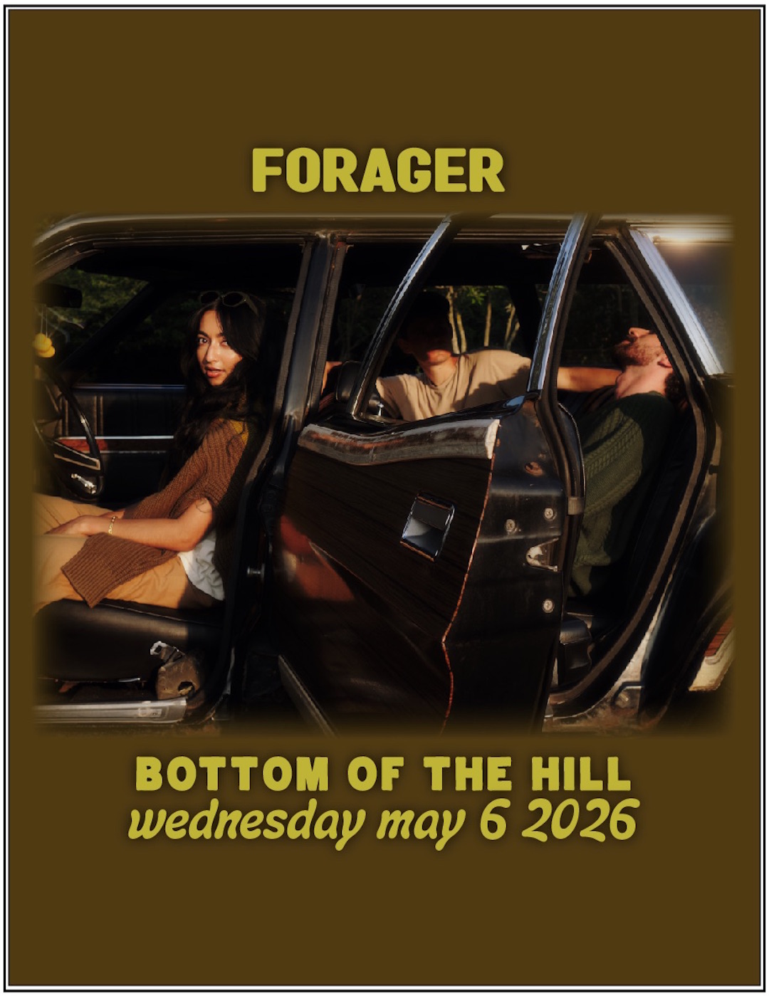 8:00PM doors -- music at 8:30PM ••• ALL AGES $18 in advance / $22 at the door FORAGER forager.band pop soul TBA ... TBA ... FORAGER -from Brooklyn, Ny -FORAGER is a Brooklyn-based trio whose music augments contemporary indie rock with intricate guitar work, melismatic vocals, and curious, shapeshifting grooves. NPR's Bobby Carter called their music "buttery" and "complex," remarking, "where have you been all my life?!?" FORAGER has built their following on the strength of their live show, selling out venues across the U.S., and opening for artists like Raveena, Salami Rose Joe Louis, and Red Baraat. Their upcoming sophomore album, Even a Child Can Cover the Sun with a Finger, ventures into rawer territory-whispered vocals over blaring sirens and distorted drums, singable psych-pop choruses that disintegrate into mayhem. The album captures the peeled-back intimacy of folk-singer-songwriters with the pulsating synchronicity that only comes from a band. TBA - - TBA - - |