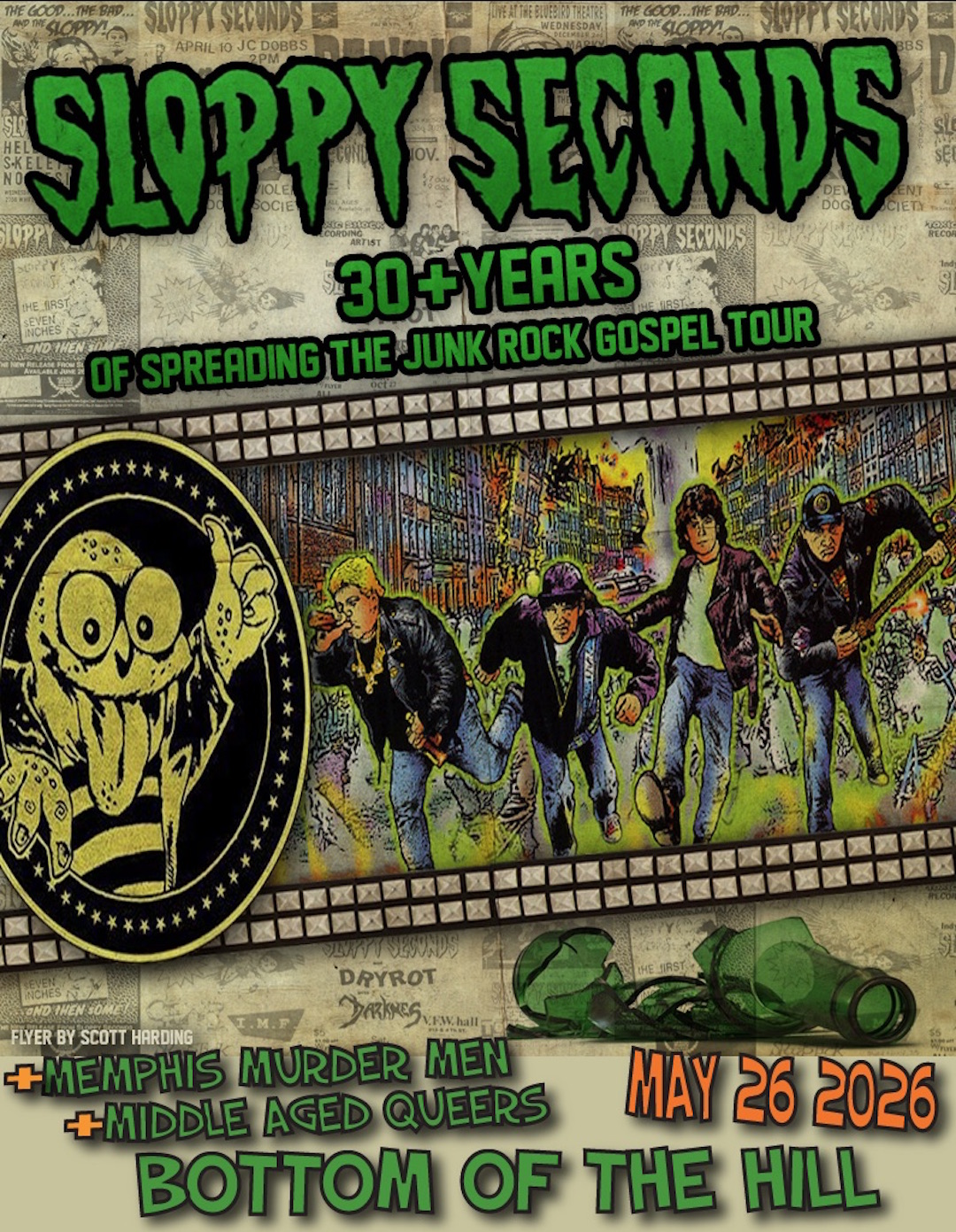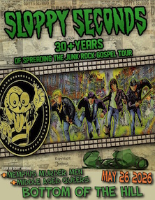 8:00PM doors -- music at 8:30PM ••• 21 AND OVER $20 in advance / $25 at the door Sloppy Seconds facebook.com/SloppySecondsJunkRock punk rock Memphis Murder Men horror punk rock and roll Middle Aged Queers punk queercore Sloppy Seconds -from Indianapolis, IN -Now long acknowledged as the undisputed Kings of Junk Rock, Sloppy Seconds has spent many years relentlessly trudging the alleys and gravel roads leading to their dumpster dynasty. The band's story began at a weekend-long house party when singer B.A., bassist Bo'ba Jam, drummer Steve Sloppy, and guitarist Roadkill set down their beers long enough to massacre a few cover tunes (hence the name Sloppy Seconds) and wake up their neighbors. After a short spell honing their original material and live intensity, the Sloppys released the amazing debut album "Destroyed" to the world. With each new release they have carved out a niche that targets themes close to their hearts: porn stars, parties, junk food, TV re-runs, beer blasts, comic books, strippers, B-Movies, 70's nostalgia, 80's cynicism, and 90’s complacency, finally spilling their trashy philosophy into every crevice and gutter of the 21st century. After a split from their original guitarist in 1993, the band promptly enlisted Ace "Spice" Hard-where, who brought not only an impressive Ramones/Cheap Trick guitar style to their sound, but also a manic stage presence to their live shows. Blasting out a suburban soundtrack for the class clowns and couch potatoes of the world, Sloppy Seconds effortlessly cross over cultural boundaries with songs full of relatable moments and funny observations. And if their songs don't reflect your lifestyle, don't bother changing the record; you’ll have more fun changing your lifestyle. Now with numerous recordings and countless live performances in their wake, Sloppy Seconds continues to spread the Junk Rock gospel to the corners of the world. Now more than ever, it’s a crusade we all need. Memphis Murder Men - - Middle Aged Queers - - |