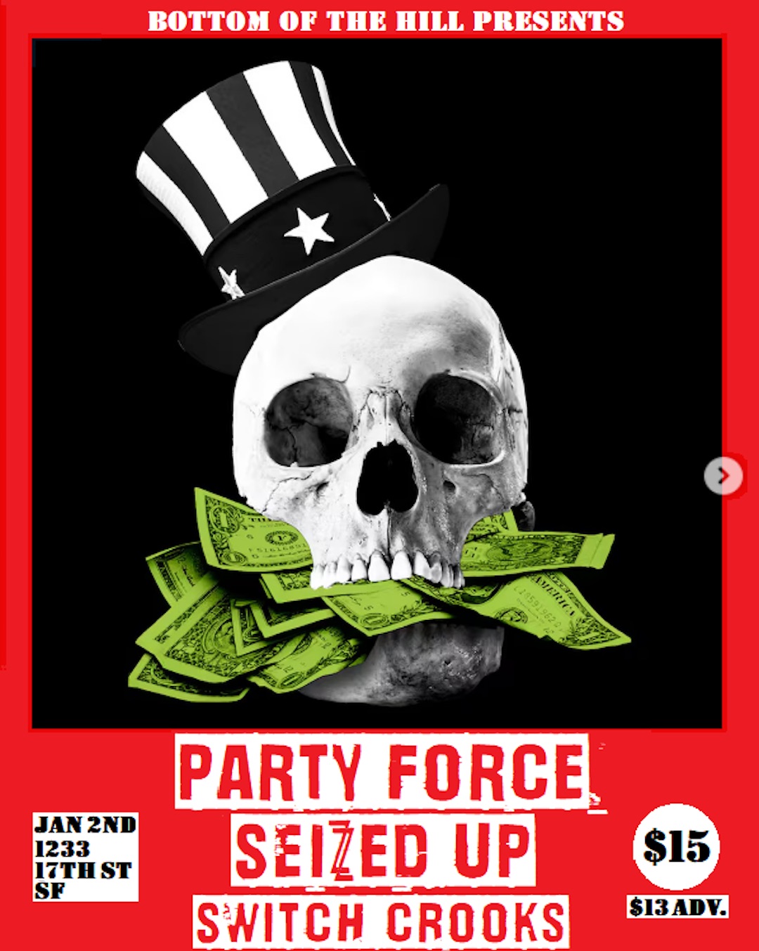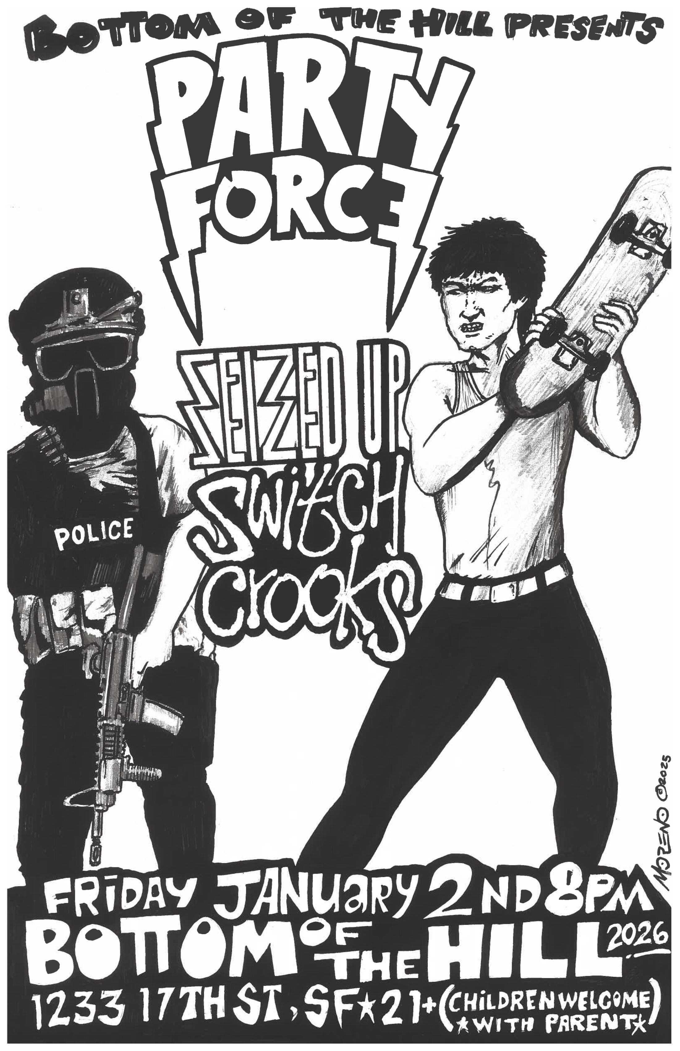 ![]() Friday January 2 2026 8:00PM doors -- music at 8:30PM ••• 21 AND OVER ![]() $15 Party Force punk Seized Up skate punk thrash Switch Crooks punk rock |