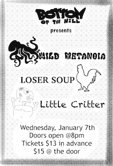 ![]() Sunday January 4 2026 7:30PM doors -- music at 8:00PM ••• 21 AND OVER $13 Cheugy hard rock, grunge and punk Deer In The Headlights Americana skate rock Super Creeps garage rock lofi punk blues |