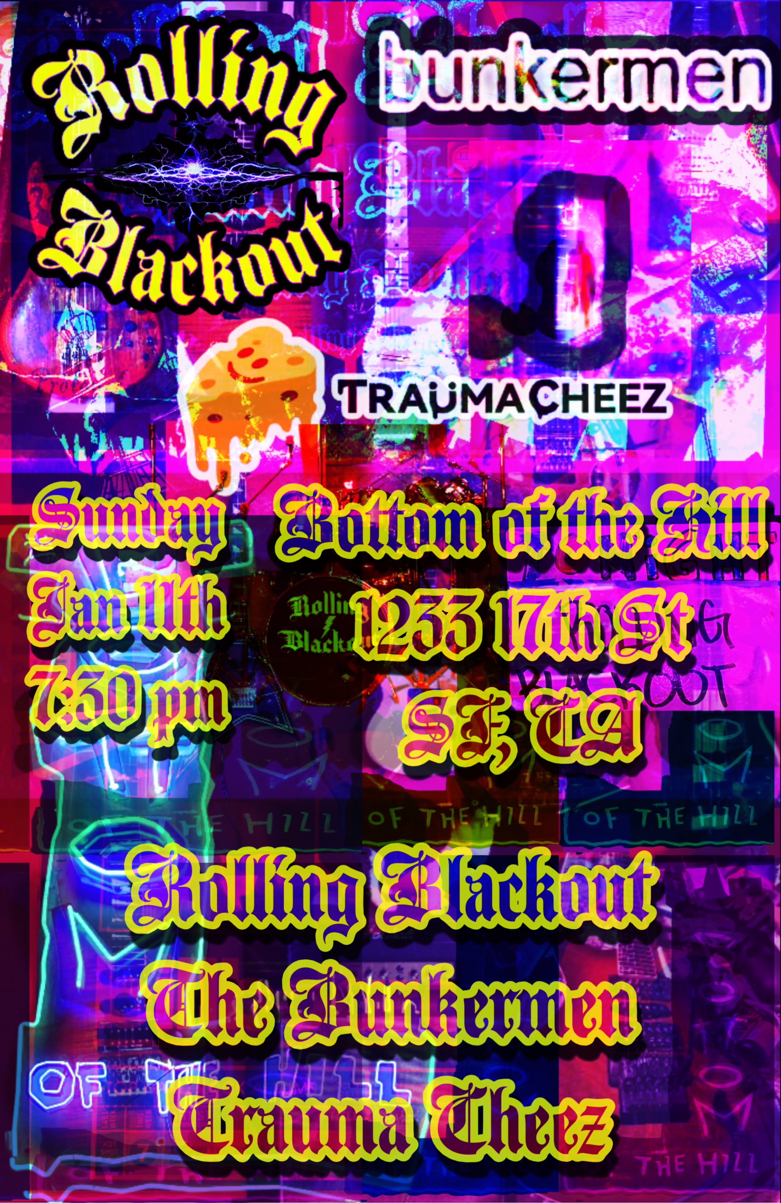 ![]() Sunday January 11 2026 7:30PM doors -- music at 8:00PM ••• 21 AND OVER $15 Rolling Blackout high energy rock The Bunkermen post-punk/pop psych rock Trauma Cheez Rock, Folk and Punk |