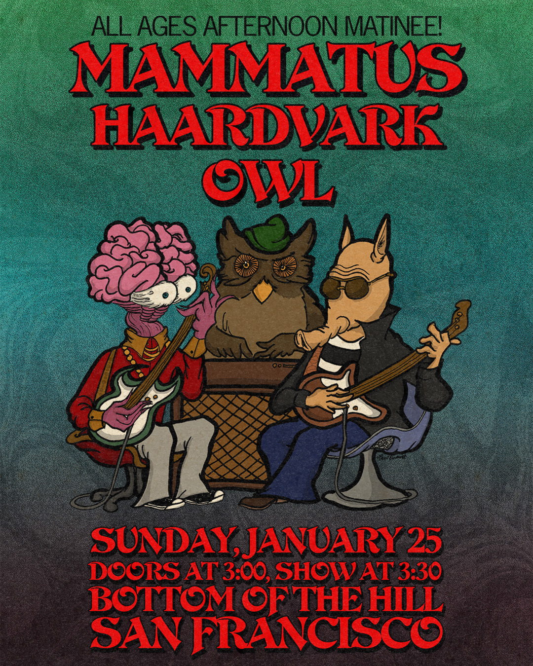 Sunday January 25 2026 3:00PM doors -- music at 3:30PM ••• ALL AGES $15 in advance / $18 at the door Mammatus psychedelic rock stoner rock Haardvark rock n' roll Owl 70's metal stoner rock |