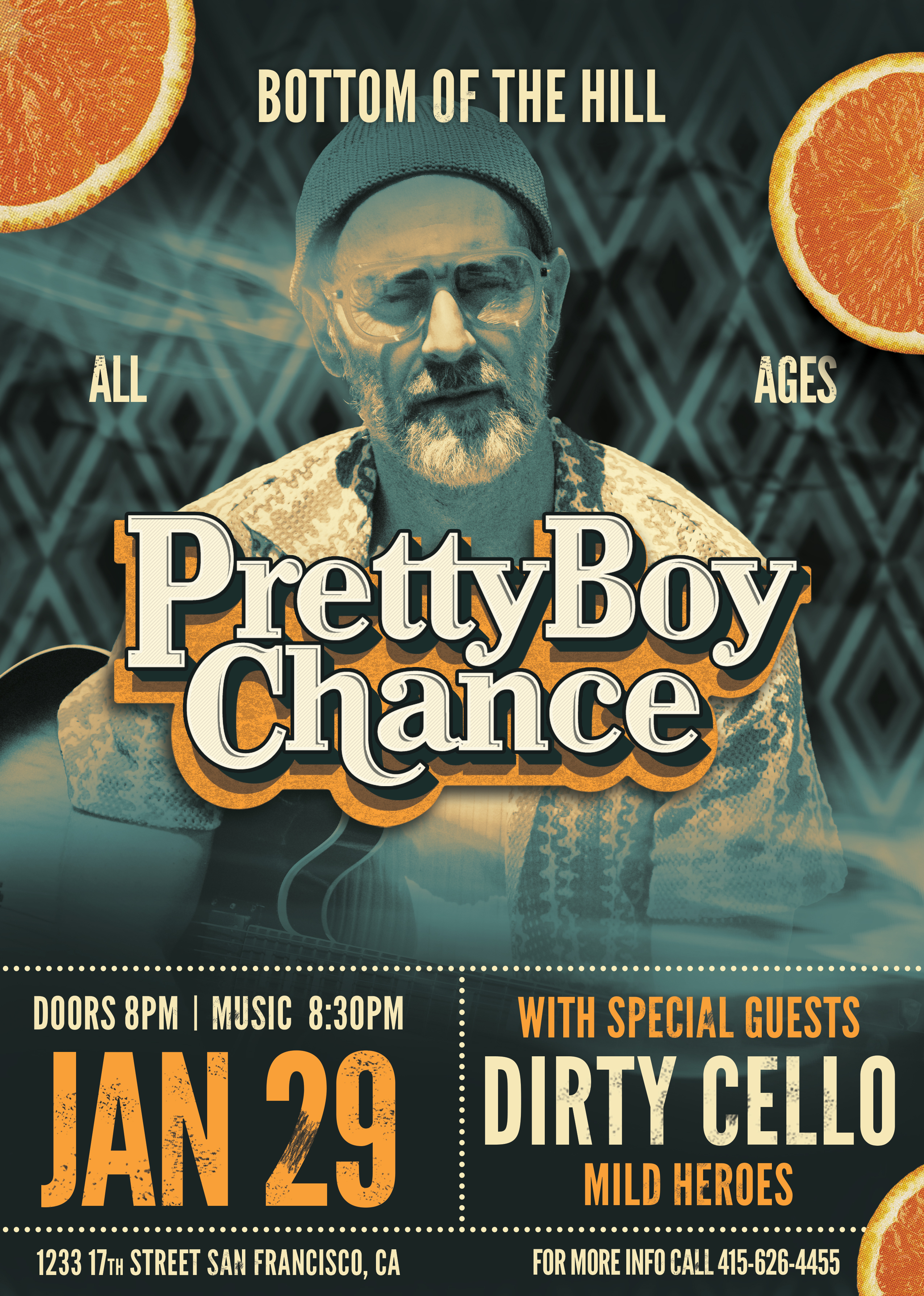 20268:00PM doors -- music at 8:30PM ••• 21 AND OVER $13 in advance / $15 at the door PrettyBoy Chance moody, indie-pop Dirty Cello blues, rock, and Americana Mild Heroes pop/rock |
