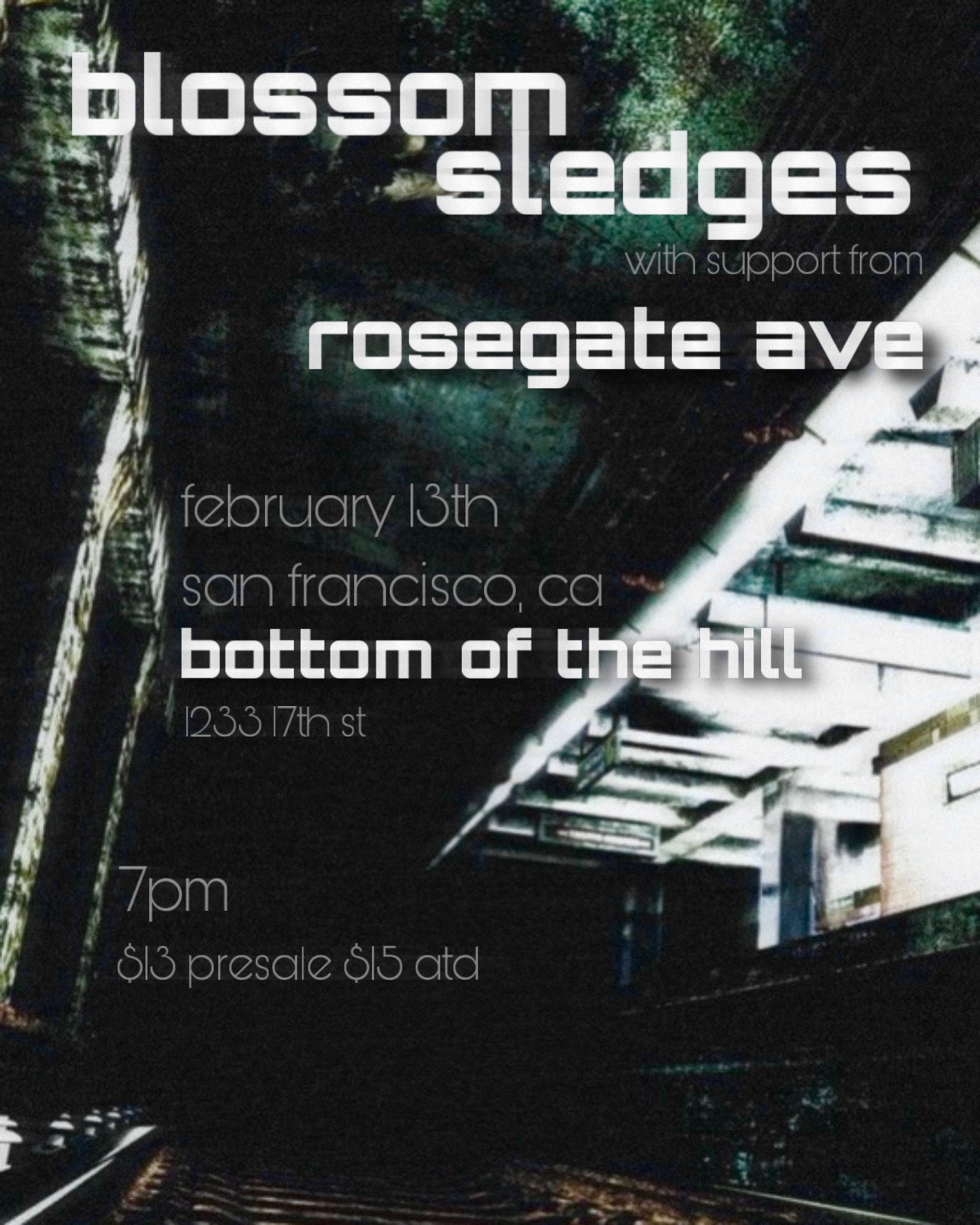 ![]() Friday February 13 2026 7:00PM doors -- music at 8:00PM ••• ALL AGES $13 in advance / $15 at the door Blossom shoegaze dream pop grunge Sledges alternative metal shoegaze Rosegate Ave. grunge shoegaze |