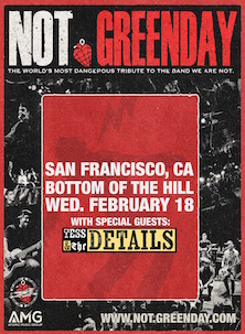 ![]() Wednesday February 18 2026 8:00PM doors -- music at 8:30PM ••• ALL AGES $15 in advance / $20 at the door NOT.GREENDAY - the world’s most dangerous tribute to the band we are NOT pop punk TBA ... TBA ... |