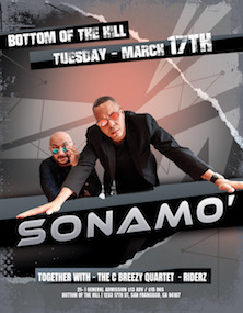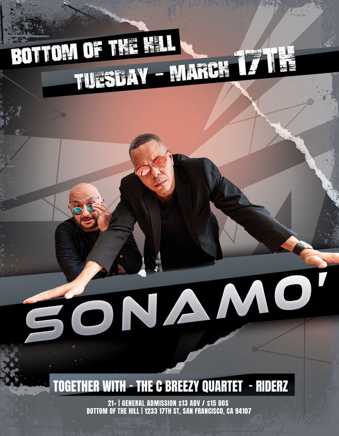 ![]() Tuesday March 17 2026 8:00PM doors -- music at 8:30PM ••• 21 AND OVER $13 in advance / $15 at the door $17.61 in advance [13 face value + 4.61 service fee] Sonamó Global Grooves with an Italian Soul The C Breezy Quartet funk blues soul Riderz alt funk |