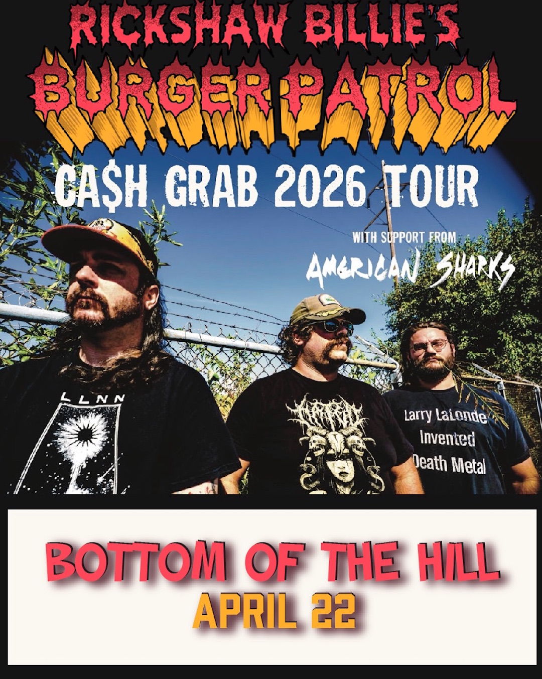 ![]() Wednesday April 22 2026 7:00PM doors -- music at 8:00PM ••• 21 AND OVER $20 in advance / $23 at the door Ca$h Grab Tour 2026 Rickshaw Billie's Burger Patrol groove metal, stoner rock American Sharks stoner rock TBA ... |