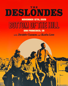 ![]() Wednesday November 12 2025 7:00PM doors -- music at 8:00PM ••• 21 AND OVER ![]() $20 in advance / $25 at the door The Deslondes Country Americana, blues, bluegrass, R&B, gospel Desiree Cannon americana country folk with special guest Karen Less -------My Dog Jack off the bill hip-hop r&b rap soul |