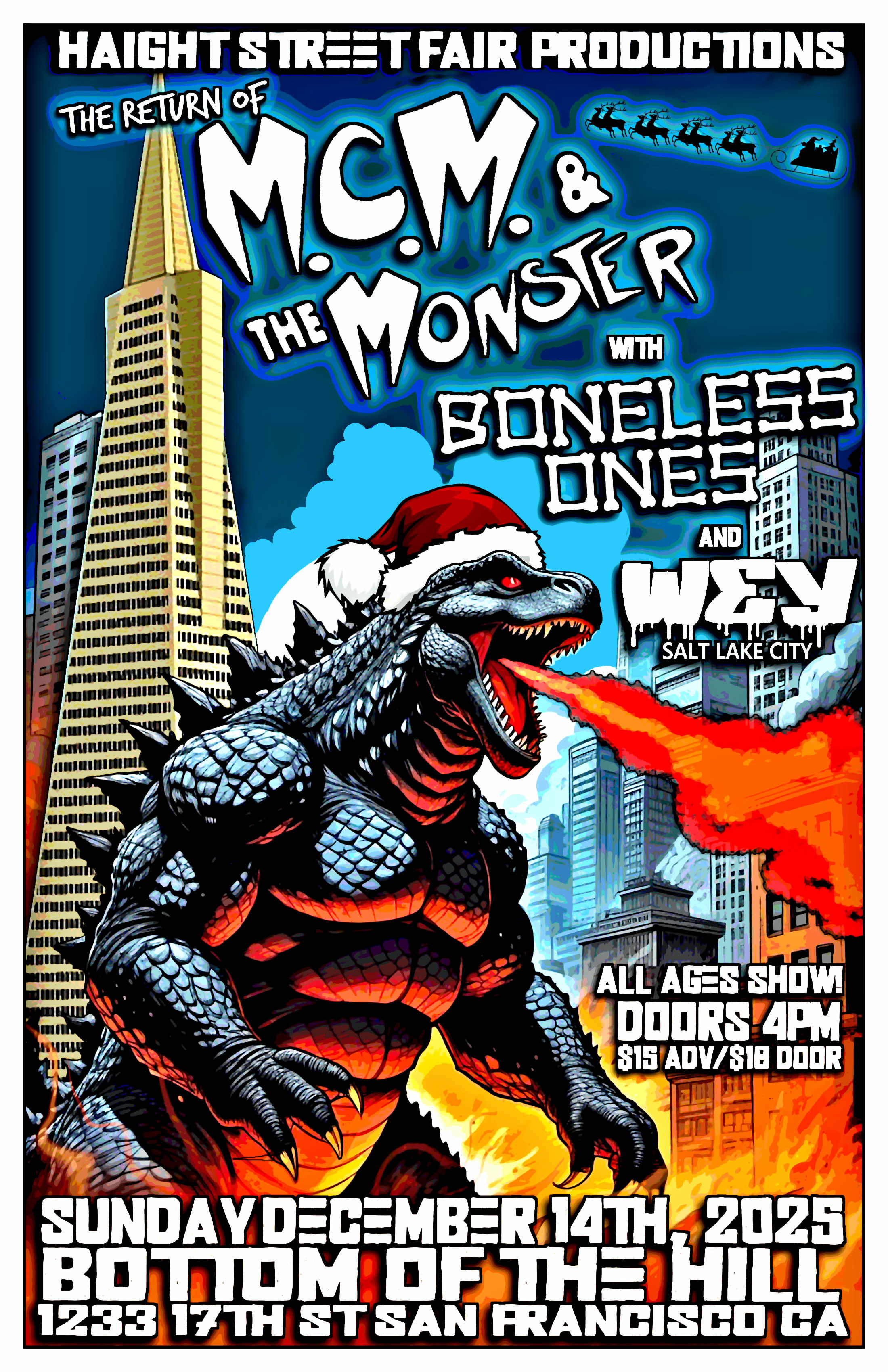 ![]() Sunday December 14 2025 4:00PM doors -- music at 4:30PM ••• ALL AGES $15 in advance / $18 at the door Haight Street Fair Productions presents... MCM and the Monster Skate Punk Rock Boneless Ones Skate Rock Rap WEY post-punk rock |
