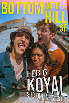 ![]() Friday February 6 2026 8:00PM doors -- music at 8:30PM ••• 21 AND OVER $13 in advance / $20 at the door Koyal Indie Pop TBA ... TBA ... |